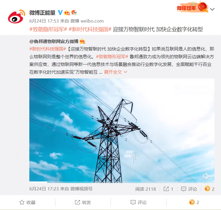 物联网,未来已来!鲁邦通将随着微博正能量和人民网深入的合作,助力千行百业在数字化时代拥抱“万物智能互联”,实现“让全球设备接入数字世界”的愿景!