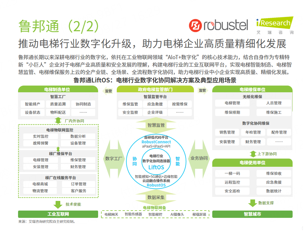 鲁邦通长期以来深耕电梯行业的数字化,依托在工业物联网领域“AloT+数字化”的核心技术能力,结合自身作为国家级专精特新重点“小巨人”企业对于电梯产业高质量和安全发展的理解,构建电梯行业的工业互联网平台,实现电梯智能制造、电梯智慧监管、电梯维保服务上云的全产业链、全场景、全流程数字化协同,助力电梯行业中小企业实现高质量、精细化发展。