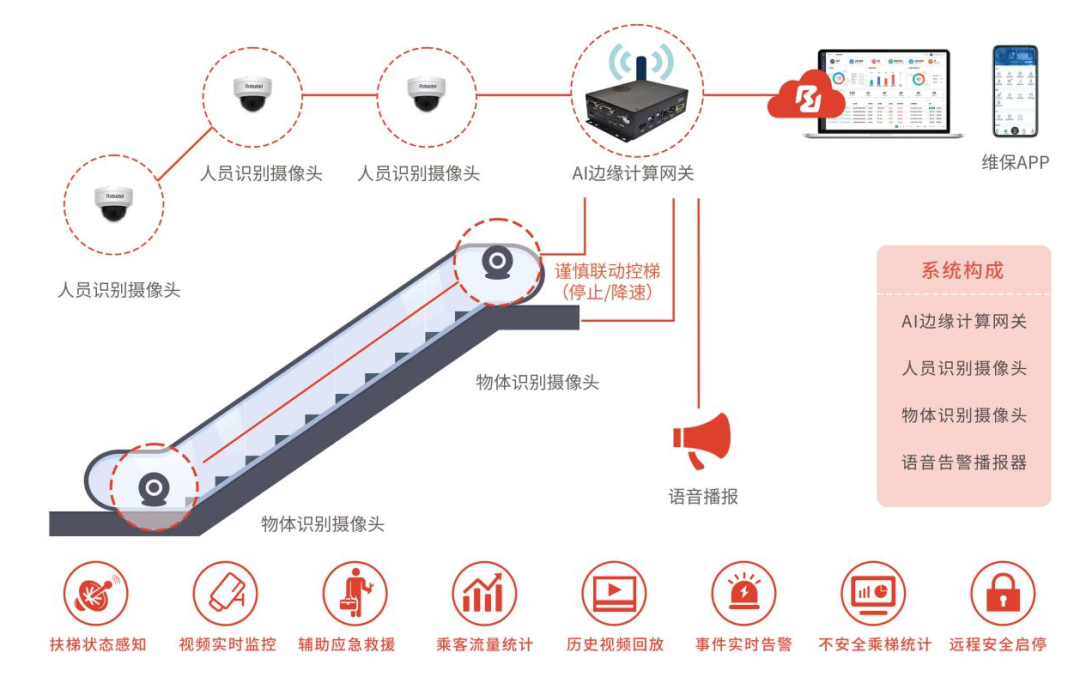 鲁邦通智能扶梯行为识别系统聚焦扶梯设备领域,紧密结合人工智能、物联网等新一代信息技术,解决扶梯不能实时监控乘梯人不安全、不文明乘梯行为的痛点问题。该系统采用全方位无死角高清AI摄像头,实时采集自动扶梯运行画面,运用高性能AI边缘计算网关进行行为分析识别,对婴儿车手推车入梯、乘客跌倒、逆行、拥挤等危险状况进行实时预警和报警,并在特定条件下联动控梯,改善客流体验,消除出口处拥堵带来的乘客摔倒风险。