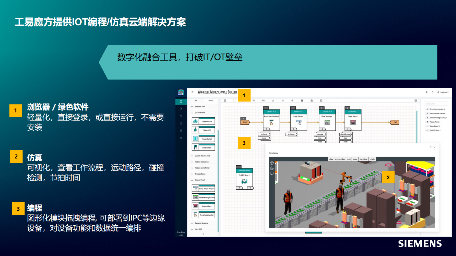 ⼯易魔⽅(Workflow Canvas)作为⼀款全⾯的云原生IT/OT集成开发⼯具包,旨在加速集成数字解决⽅案的开发进程。它配备了基于⽹⻚的图形化⼯程⼯具,⽀持本地或云端部署,极⼤地⽅便了⽤户操作。该⼯具包采⽤直观的拖放式界⾯,为开发⼈员带来了流畅的操作体验。同时,它促进了IT与OT⼯程师之间的紧密合作,使他们能够共同优化涉及众多OT设备、IT系统及算法的集成⼯作流程,实现⾼效协同作业。