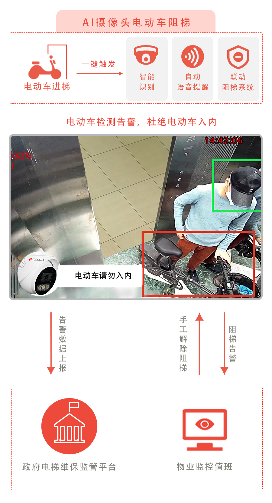 鲁邦通适时推出了智慧物业电梯管理解决方案,实现对电动车禁止进入电梯的安全管理,通过智能摄像头自动识别电动车入梯行为,发出警报提醒,并支持自动阻止电梯关门,让电梯处于停止运行状态,有效监控电动车入梯行为,消除消防隐患,还能帮助进行责任追溯。