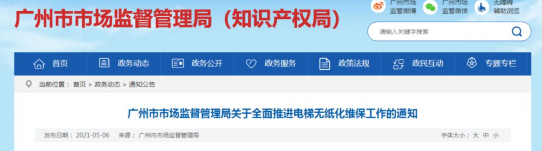 2021年5月,广州市市场监督管理局发布《关于全面推进电梯无纸化维保工作的通知》,明确在全市范围内推进电梯无纸化维保工作;