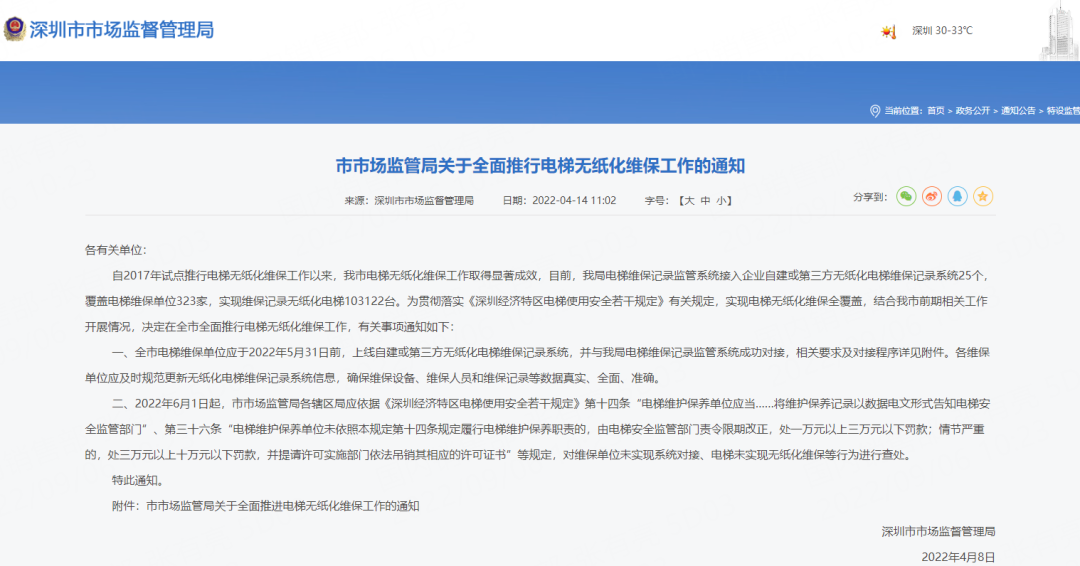 2022年4月,深圳市市场监督管理局也发布了《关于全面推进电梯无纸化维保工作的通知》,对维保单位未实现系统对接、电梯未实现无纸化维保等行为进行查处。
